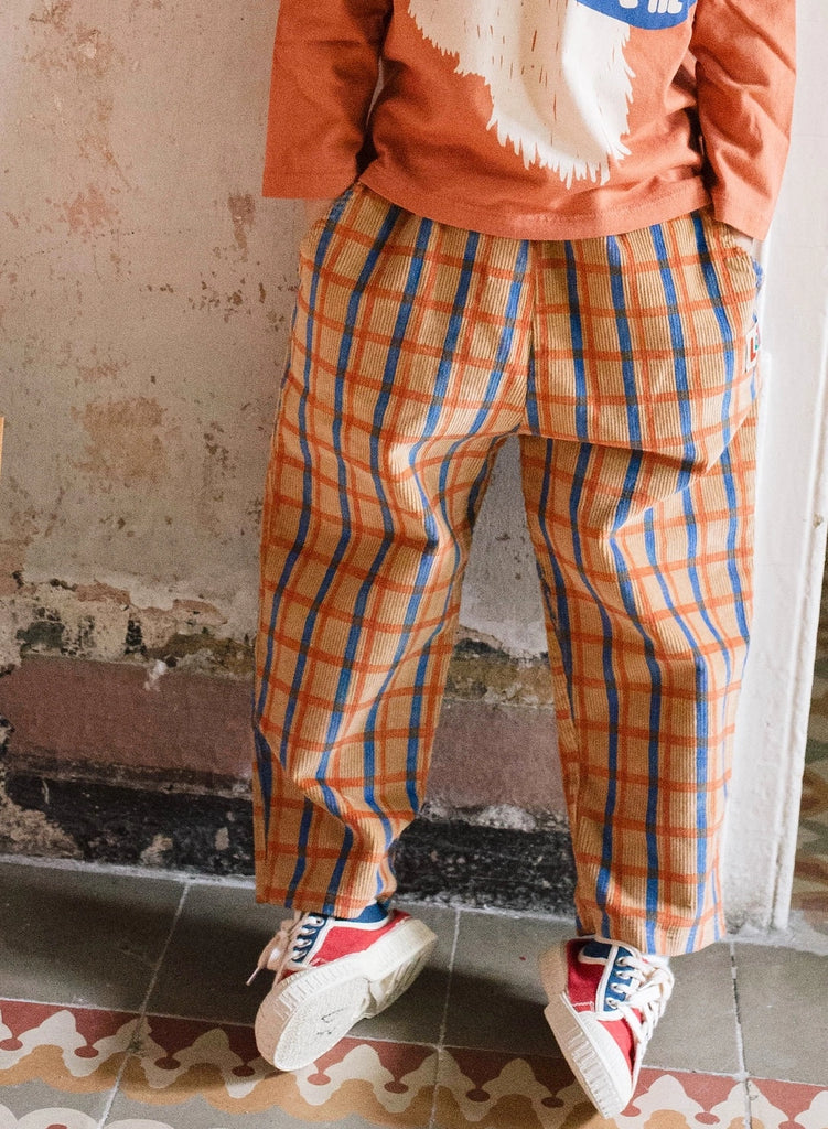 - hellbraune Cordhose von Lötiekids mit blau roten Karomuster
